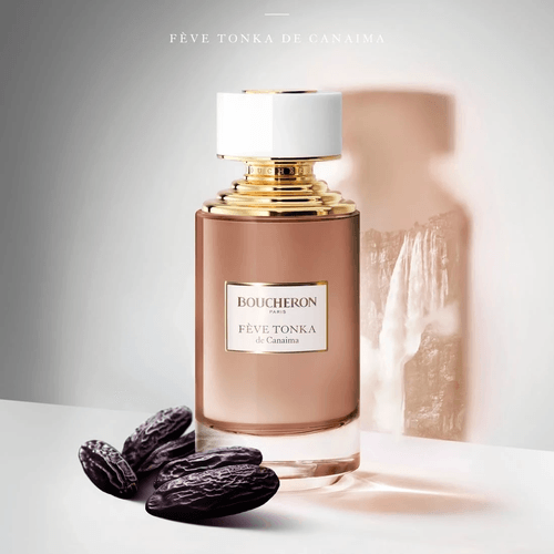 Fève tonka de Canaima de Boucheron est une nouveauté qui célèbre cette précieuse fève aromatique aux multiples facettes. Une eau de parfum ambrée, boisée, addictive et envoûtante soulignant toute la voluptuosité de cette note gourmande. En tête la douceur de l'essence d'amande amère associée à la note poudrée de violette met en lumière le fruit, de sa noix à sa pulpe. C'est en coeur que l'Absolu de tonka révèle l'élégance de la fève, grâce à un absolu de rose de Turquie et à une essence de patchouli énigmatique qui donnent alors toute sa profondeur. En fond, c'est la note ambrée, vanillée et lactée de la matière qui caresse la peau, laissant place à un doux sillage de santal. La Fève tonka est sublimée dans un coffret écrin habillé d'or et de blanc, dont le tiroir, ponctué d'un ruban brun chocolat, s'ouvre sur un flacon aux même tonalités.